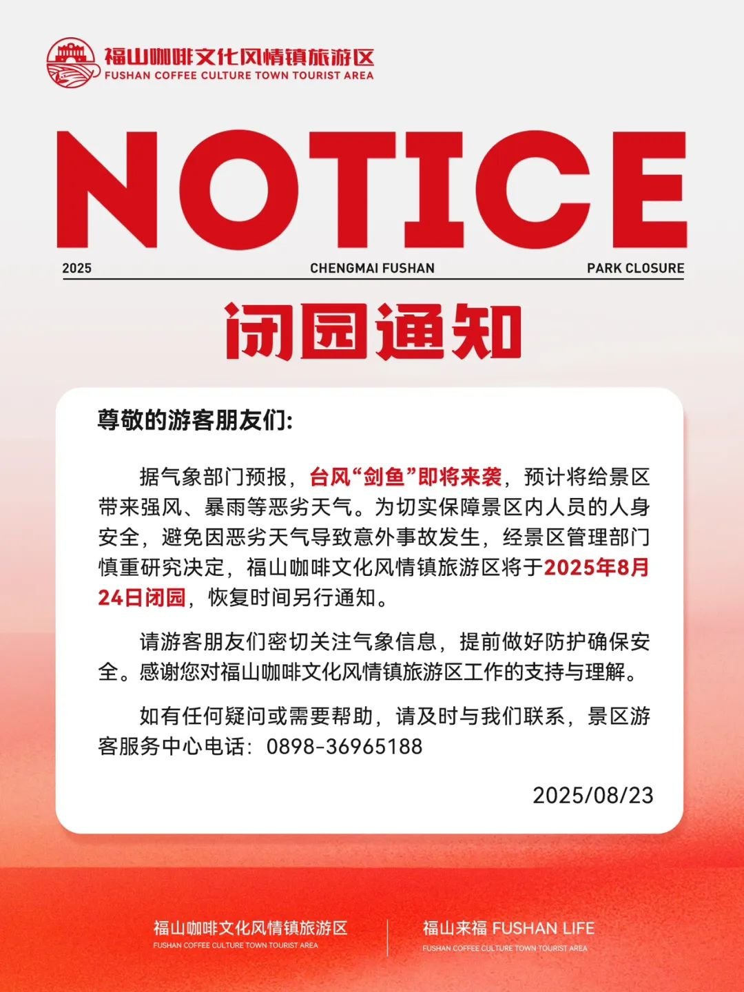 商报全媒体讯(椰网/海拔新闻记者 张艺)受台风“剑鱼”影响,澄迈福山咖啡文化风情镇旅游区将于8月24日闭园且暂停营业,具体开园时间另行通知,望广大市民游客不要“跑空”。