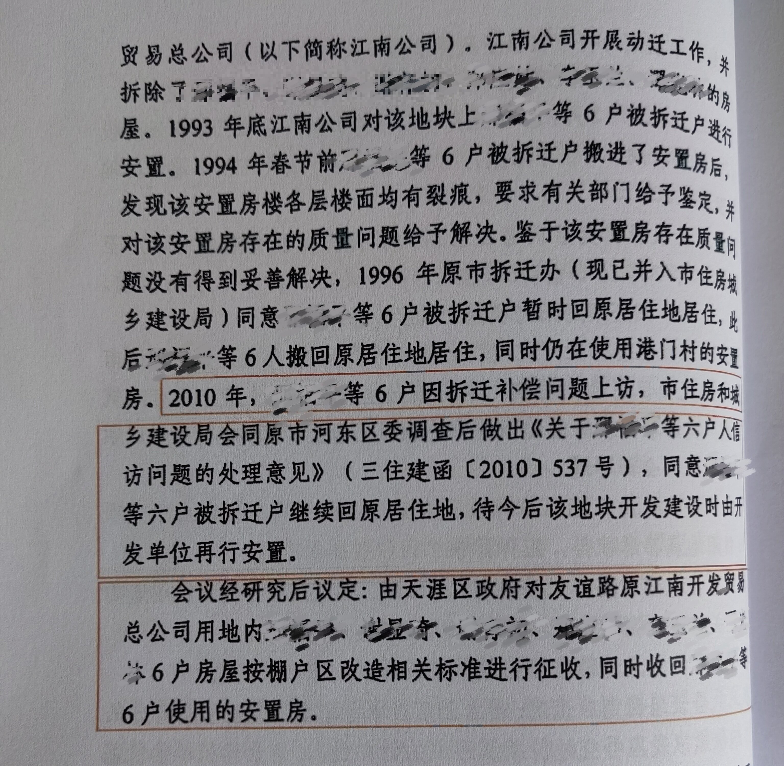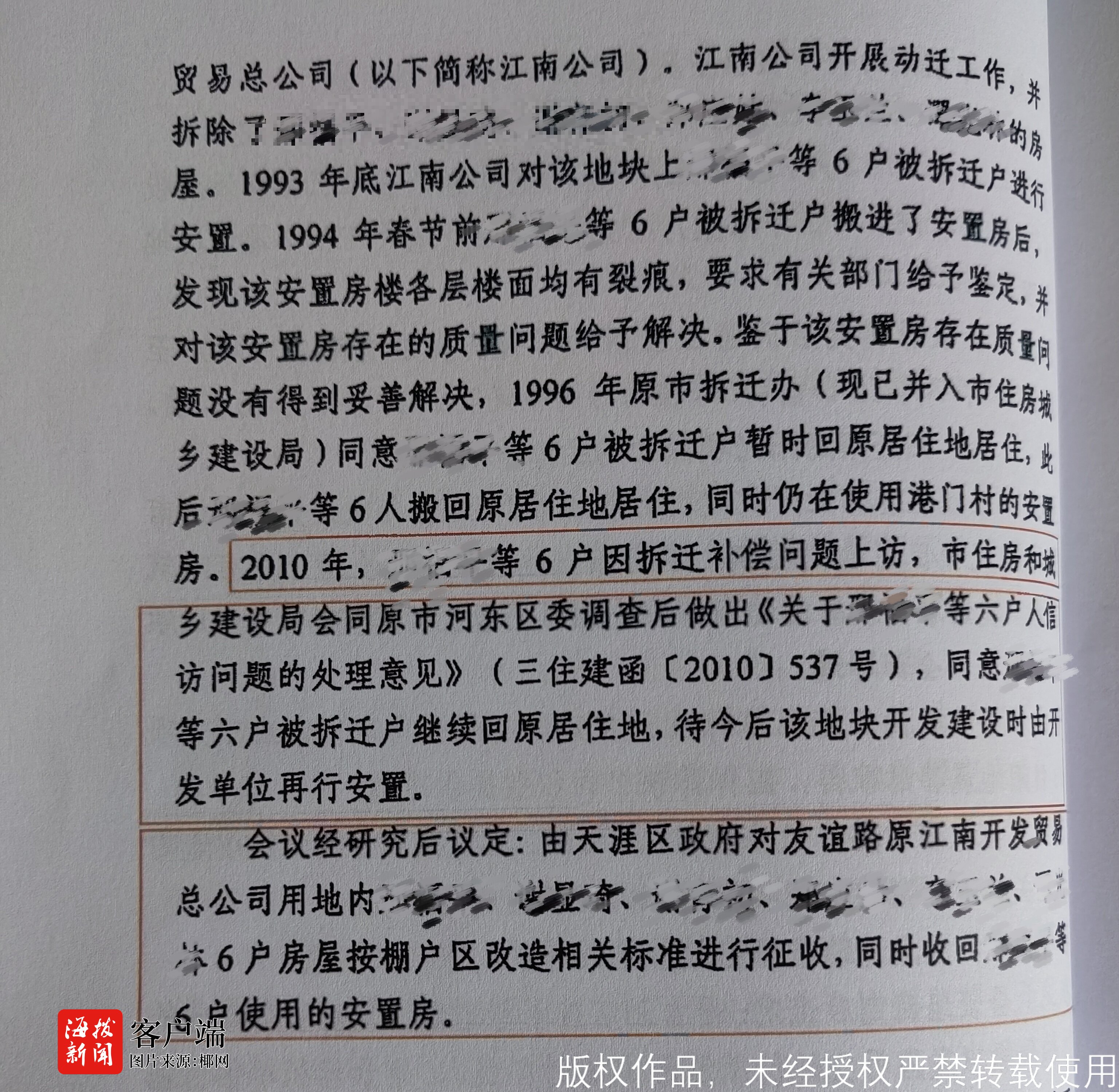 8月4日,三亚市住建局函复,1992年友谊路拆迁事宜由三亚市拆迁安置办公室实施,因政府机构改革,三亚市拆迁安置办公室现已不存在。三亚市住建局成立后,该项目的相关材料未移交至该局。1993年,江南公司作为拆迁人与被拆迁人邢先生等6户就拆迁安置补偿已达成协议,江南公司将上述6户安置于港门村东一路一巷的原安置房并支付相应安置费合计543328.06元。因安置房质量存在问题,1996年,经邢先生等人申请,三亚市拆迁安置办公室同意邢先生等6户暂时回原居住地居住,待今后该地块开发建设时由开发单位再行安置,其后安置房一直被邢先生等6户使用近30年并未收回。