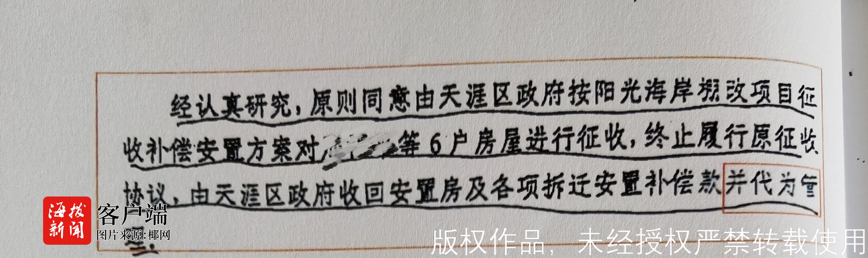 三亚市天涯区棚改办在8月11日的回函中表示,邢先生等6户已签订《安置房调换协议》《安置房调换协议(补充协议)》,选择用“阳光海岸”项目安置房房源调换江南公司安置房,并将调换房屋更换为“货币补偿”或“产权置换+货币补偿”。根据协议约定天涯区政府共向邢先生支付各项补偿、补助、奖励款等4005187.91元。邢先生等6户已领取拆迁补偿款及配合拆迁奖励款。