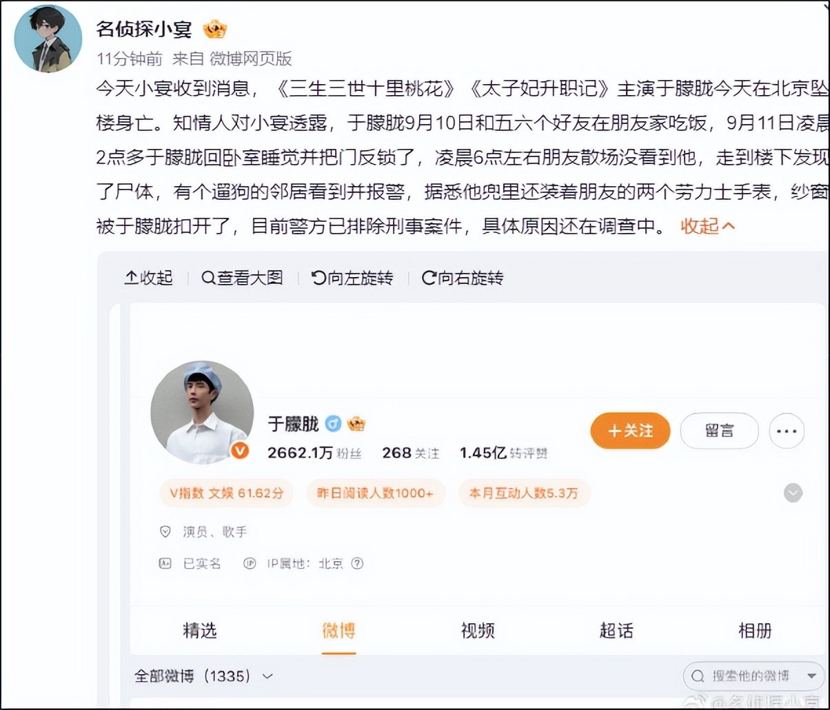 9月11日,@名侦探小宴发文称于朦胧在北京坠楼身亡,消息引发多方关注。