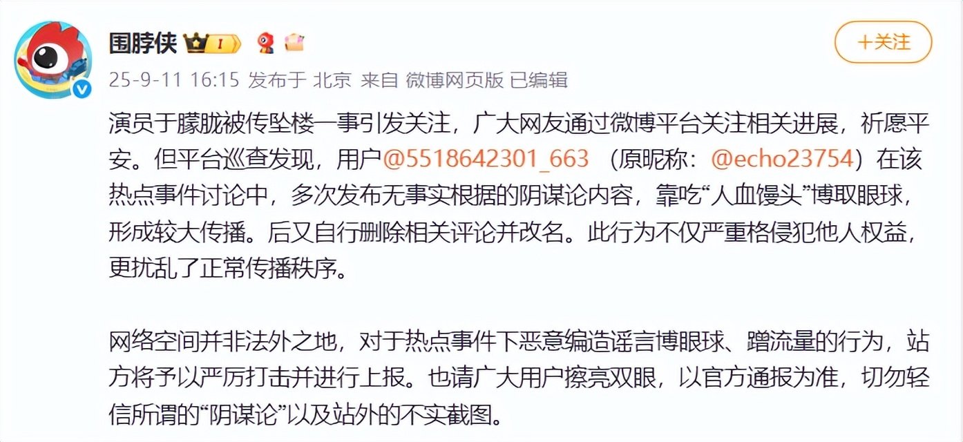 11日下午@围脖侠发文:演员于朦胧被传坠楼一事引发关注,广大网友通过微博平台关注相关进展,祈愿平安。但平台巡查发现,用户@5518642301_663(原昵称:@echo23754)在该热点事件讨论中,多次发布无事实根据的阴谋论内容,靠吃“人血馒头”博取眼球,形成较大传播。后又自行删除相关评论并改名。此行为不仅严重侵犯他人权益,更扰乱了正常传播秩序。