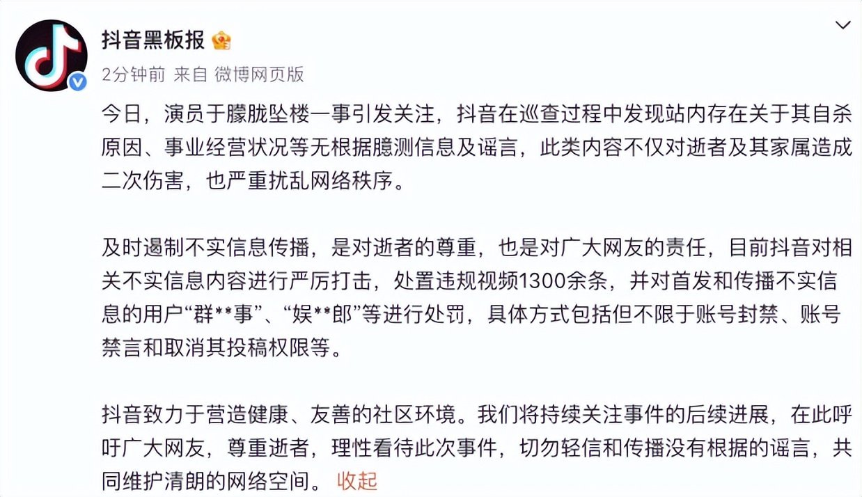 据@抖音黑板报 消息,9月11日,演员于朦胧坠楼一事引发关注,抖音在巡查过程中发现站内存在关于其自杀原因、事业经营状况等无根据臆测信息及谣言,此类内容不仅对逝者及其家属造成二次伤害,也严重扰乱网络秩序。
