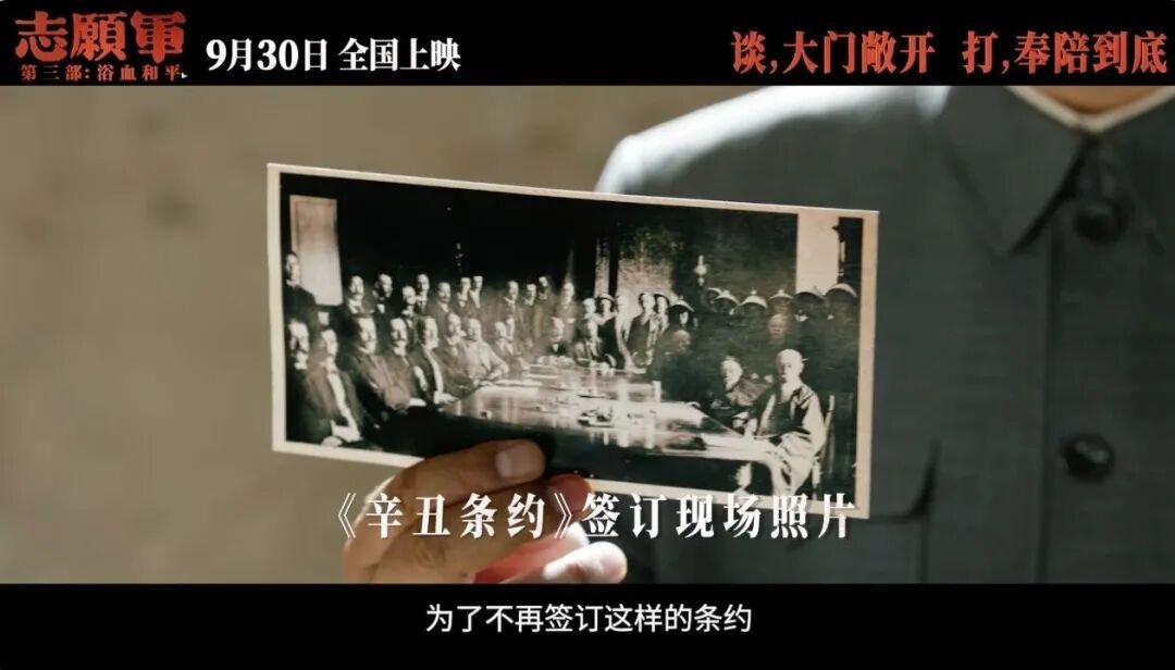 承载历史屈辱的《辛丑条约》签订现场照片,时时警醒我们勿忘国耻。影片中,志愿军战士咬死不放,誓要为后世留下不一样的照片:“我们会给50年后21世纪的中国人,留下一张怎样的照片?”