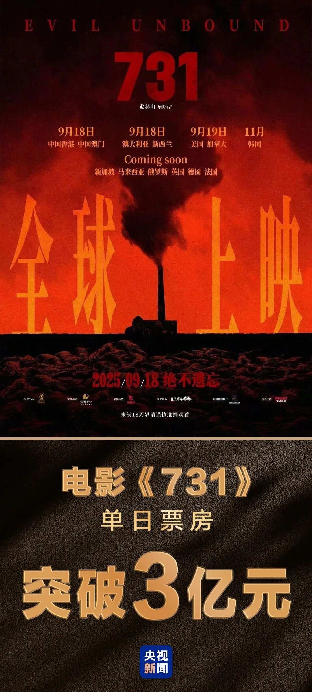 电影《731》今天在全球上映。据网络平台数据,截至18日19时53分,单日票房突破3亿,刷新中国影史纪录。