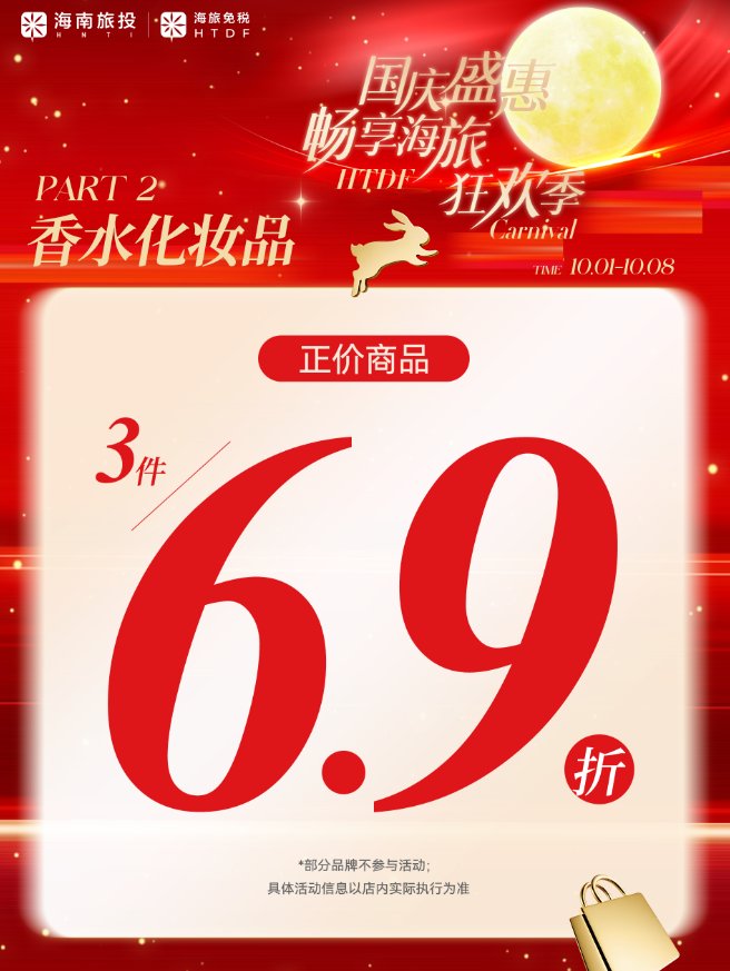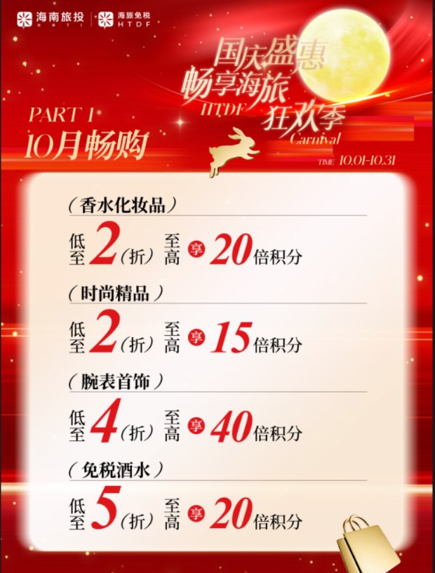 双节期间,海旅免税聚焦市民游客假期消费需求,助推离岛免税消费,推出全岛免税超低惊爆价商品活动。包含香化正价商品3件69折,全品类精选品牌五倍积分,还有明星爆品限时秒杀、精选品牌满额立减、大牌惊喜盲盒、新用户赠券、消费满额返券等福利。同时,联合纪梵希打造彩妆秀快闪活动,提供免费补妆服务和互动礼赠,增添假日美妆乐趣。