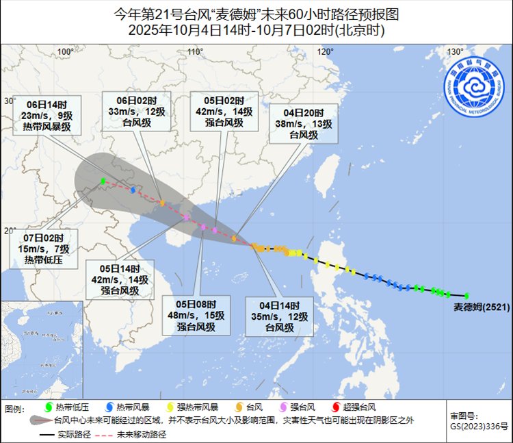 台风“麦德姆”将于5日上午在文昌登陆或近海擦过(台风级或强台风级,13~14级,40~45米/秒)。