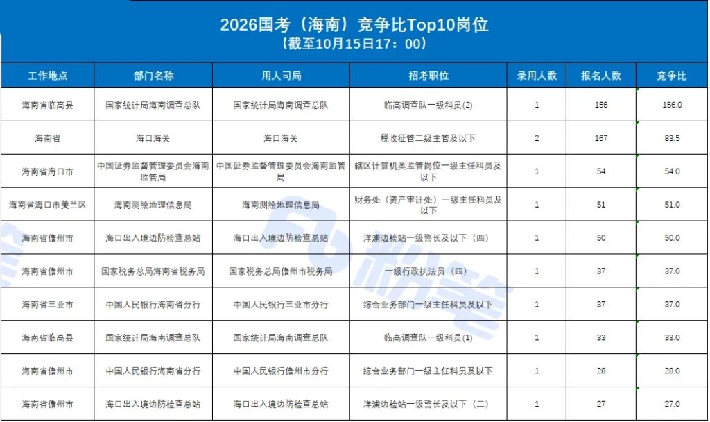 竞争比排名前十中,来自“国家统计局海南调查队”的“临高调查队一级科员(2)”这一职位排名第一,竞争比高达156:1。