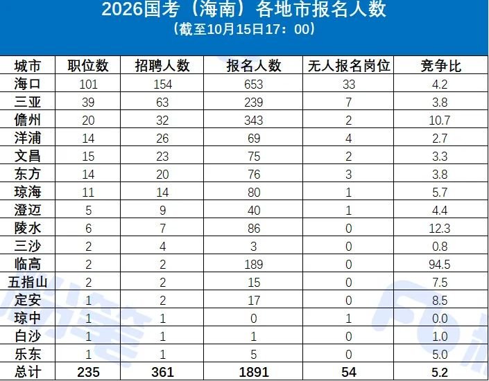 商报全媒体讯(椰网/海拔新闻记者 许文玉)10月15日,记者获悉,中央机关及其直属机构2026年度国家公务员考试(简称2026年国考)录用公务员正式开始报名,截至17:00,海南省报名人数1891人,过审人数29人,整体竞争比5.2:1,剩余无人报名岗位有54个。据悉,今年共计划招录3.81万人,海南235个岗位共招361人。