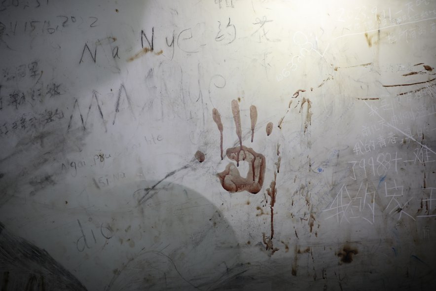 图为徐发启犯罪集团关押电诈人员的小黑屋内,墙上留下的血手印。(公安部供图)