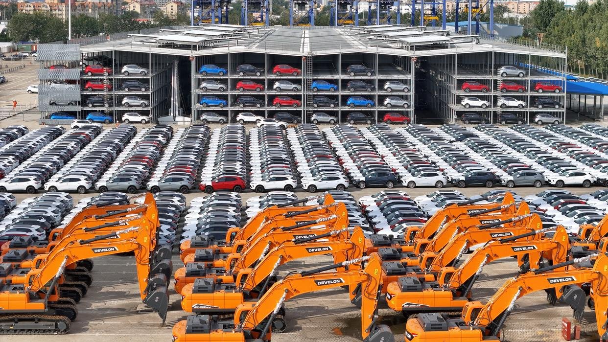 10月20日,国产汽车和工程机械在山东港口烟台港集结等待装船出口(无人机照片)。新华社发(唐克摄)