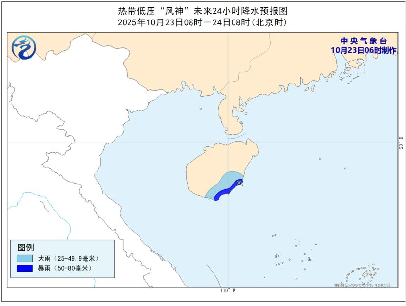 降水预报:23日08时至24日08时,海南岛南部部分地区有大雨,局地暴雨(50~80毫米)。