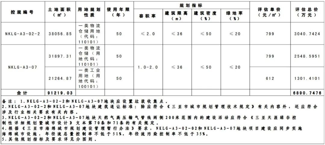 本次挂牌出让宗地位于三亚天涯绿谷控规NKLG-A3-02-2和NKLG-A3-07地块,总面积91219.03平方米,用地四至及界址坐标详见地块勘测定界图。其中:1.控规NKLG-A3-02-2地块,面积38056.85平方米;2.控规NKLG-A3-07地块,面积53162.18平方米。经核查《三亚市国土空间总体规划(2021-2035年)》“三区三线”划定成果,NKLG-A3-02-2、NKLG-A3-07地块均位于城镇开发边界外,均不涉及占用永久基本农田及生态保护红线。该项目属于“平急两用”公共基础设施,符合海南省自然资源和规划厅印发的《关于规范城镇开发边界管理的通知(试行)》(琼自然资函〔2024〕432 号)第三条第(三)款“结合城乡融合、区域一体化发展和旅游开发、边境地区建设、‘平急两用’公共基础设施建设、有邻避效应影响等合理需要,在城镇开发边界外可规划布局有特定选址要求的零星城镇建设用地”情形;同时,该项目已纳入《三亚市国土空间总体规划(2021-2035年)》重点建设项目安排表。经核查《三亚市人民政府关于同意〈三亚天涯绿谷控制性详细规划暨城市设计〉NKLG-A3-02-1等地块控规分图则的批复》(三府函〔2025〕594号),控规NKLG-A3-02-2地块规划用地性质为一类物流仓储用地(代码:110101),控规NKLG-A3-07地块规划用地性质为一类物流仓储混合一类工业用地(代码:110101/100101),用地混合比例为6:4。其中,一类物流仓储用地面积为31897.31平方米,一类工业用地面积为21264.87平方米。