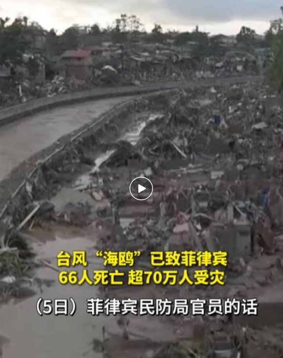 据央视新闻消息,当地时间11月5日消息,菲律宾民防局官员表示,台风“海鸥”已经导致当地66人死亡,另有26人失踪。受灾人口超过70万,有34万余人目前居住在安置中心。