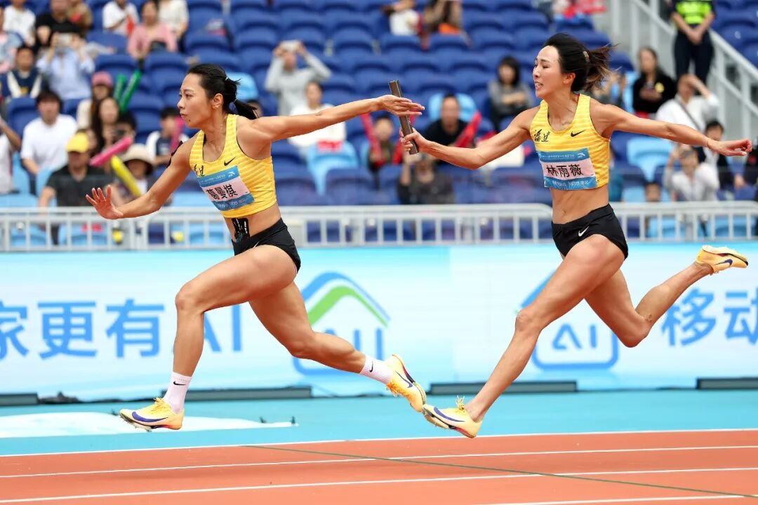 △11月15日,十五运会4×100米混合接力预赛,林雨薇(右)、葛曼棋(左)在比赛中。