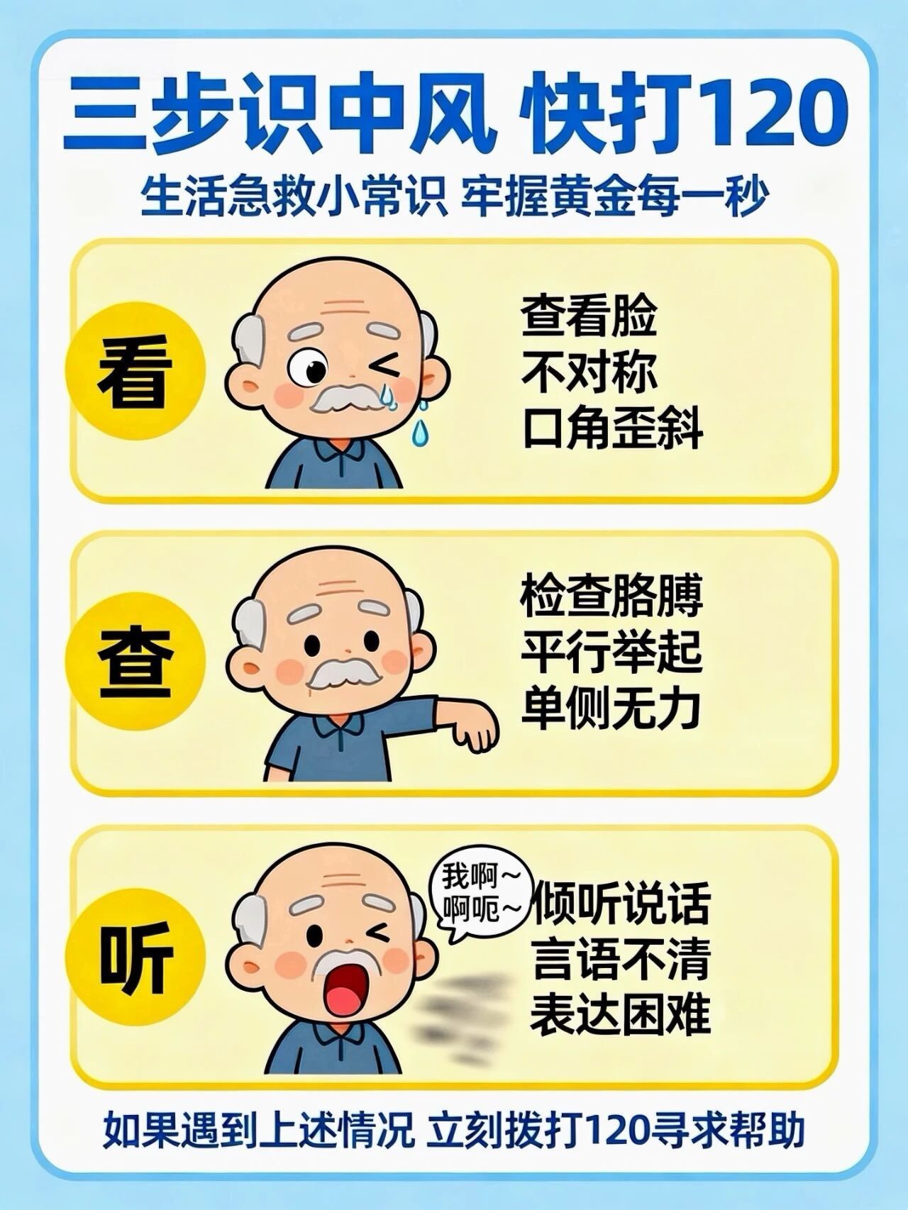 李威提醒,脑梗死(脑中风)是我国致残率和死亡率最高的疾病之一。时间就是大脑,早识别、早送医至关重要。如果您或身边的人出现症状,请立即拨打急救电话。一是微笑困难,口角歪斜,脸部不对称。二是手臂无力,一侧手臂无法平行举起或无力下垂。三是言语不清,说话困难、表达不清或理解障碍。此外,还要牢记“中风120”口诀:“1”看1张脸(是否不对称,口角歪斜)“2”查2只胳膊(是否单侧无力)“0”(聆)听语言(是否表达困难)。