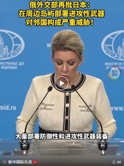 俄罗斯外交部发言人扎哈罗娃27日说,日本在周边岛屿部署进攻性武器损害地区安全稳定,对邻国构成严重威胁。