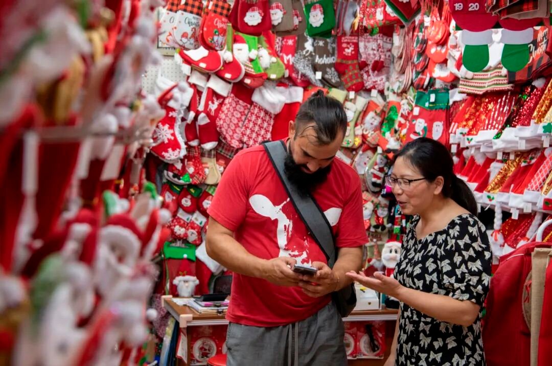 2024年7月9日,浙江省义乌国际商贸城一区,来自波兰的外商在采购圣诞用品时,与店主进行交流。时宽兵摄(中经视觉)
