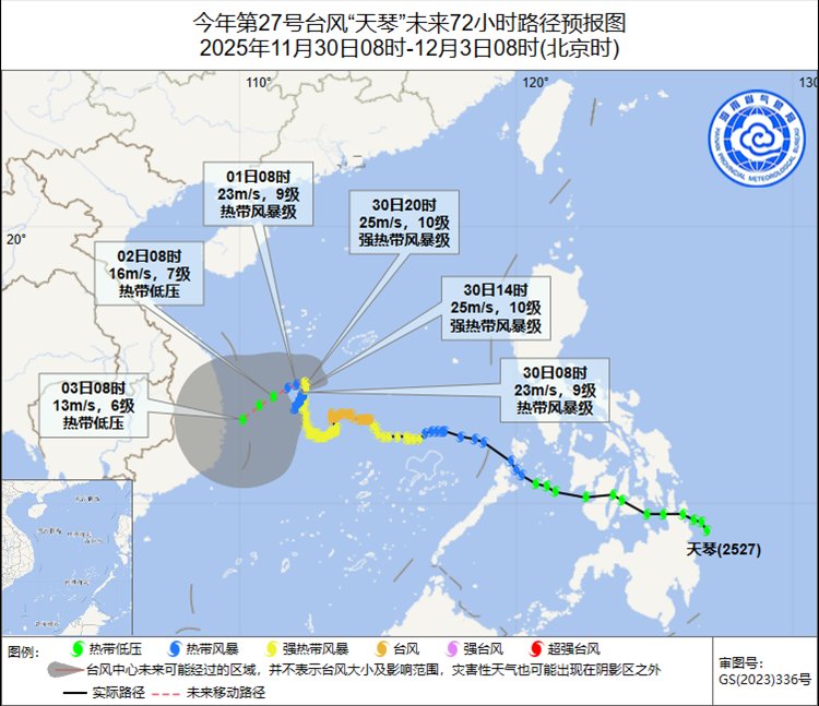 “天琴”在南海中西部海面回旋少动,12月2日夜间将在南海中西部海域减弱消散,11月30日—12月2日白天南海大部分海域仍有大风天气,海上平台和各类船只需继续做好避风措施。