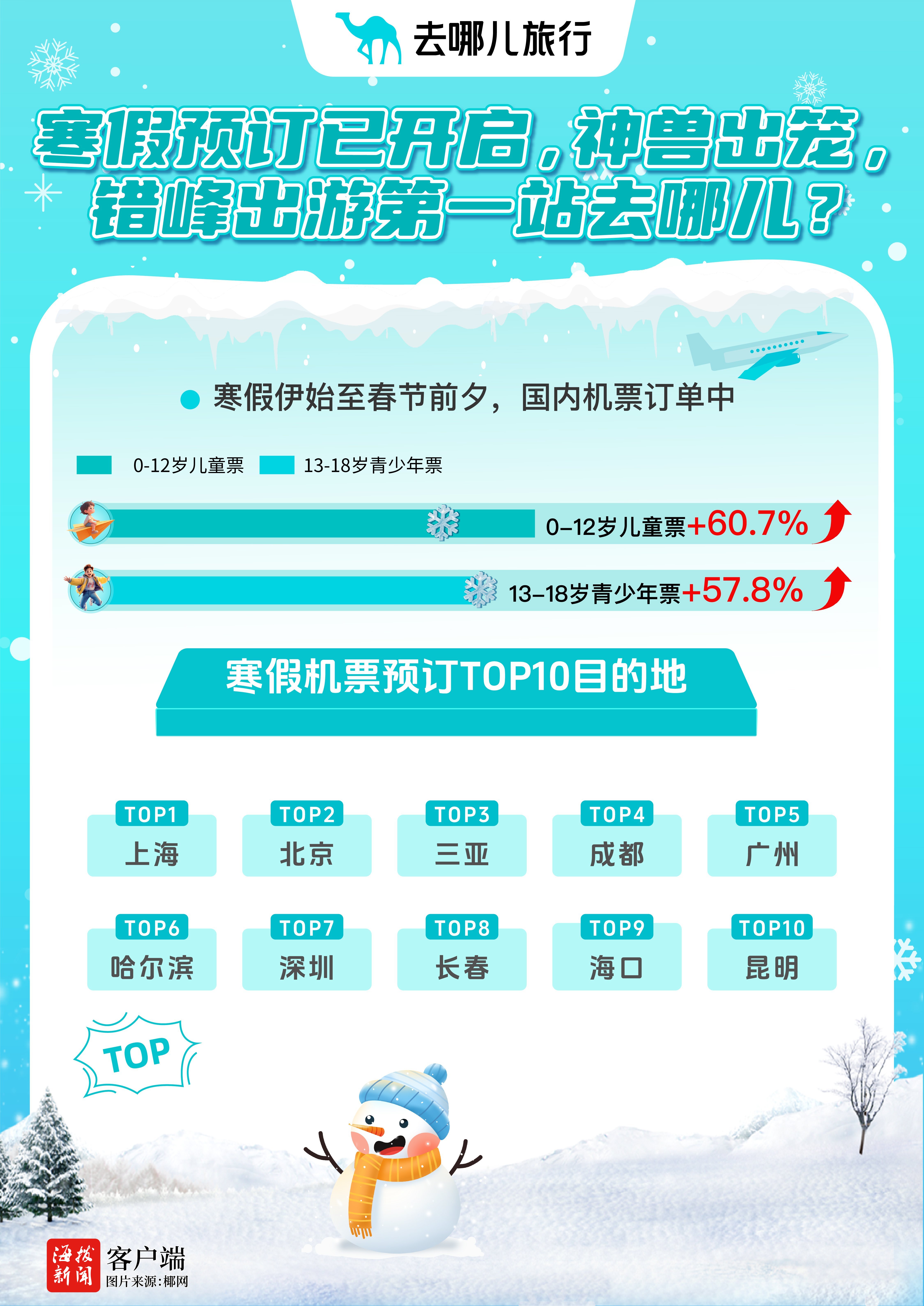没有雪假的其他中小学生,也等来了寒假的消息,最长的寒假将达到45天。寒假时间陆续公布后,第一批赶在春节前错峰出游的家庭已经订好优惠机票。据去哪儿数据,寒假前半段,0-12岁儿童的机票预订量同比增长60.7%。三亚、珠海、西双版纳等避寒城市的机票预订同比均翻倍增长。