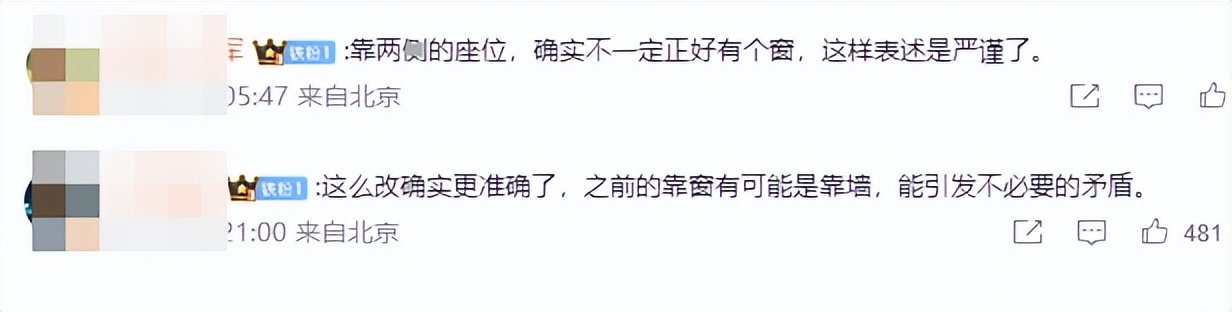 部分网友评论:靠两侧的座位,确实不一定正好有窗,这样表述是严谨了。