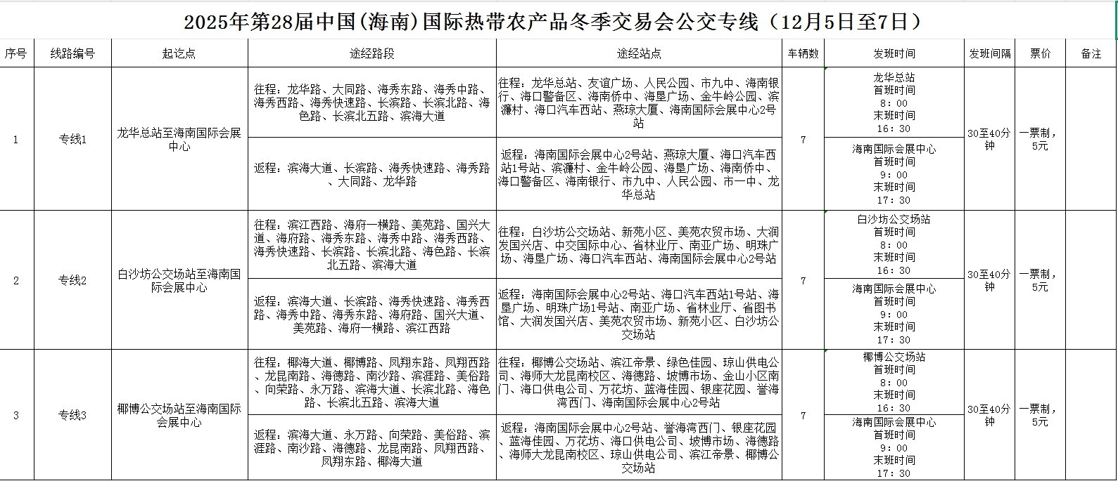 据了解,为方便市民游客前往冬交会现场,海口公交开通专线1(龙华总站至海南国际会展中心)、专线2(白沙坊公交场站至海南国际会展中心)、专线3(椰博公交场站至海南国际会展中心)等3条冬交会公交专线。保障时间为市区始发站首班8:00、末班16:30,海南国际会展中心首班9:00、末班17:30,发车间隔为每班30-40分钟,根据实时客流动态发班,票价实行一票制5元。