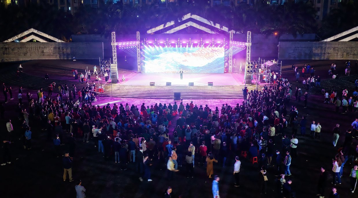 舞台区域是活动的核心焦点。5日19时30分,随着儋州调声的悠扬旋律响起,活动正式拉开帷幕。这一融合方言韵律与集体歌舞的国家级非遗项目,以多声部合唱的形式演绎千年非遗韵味,瞬间点燃全场氛围。观众们或驻足跟唱,或举手机记录,不少家庭全家出动,跟着节奏摇摆。