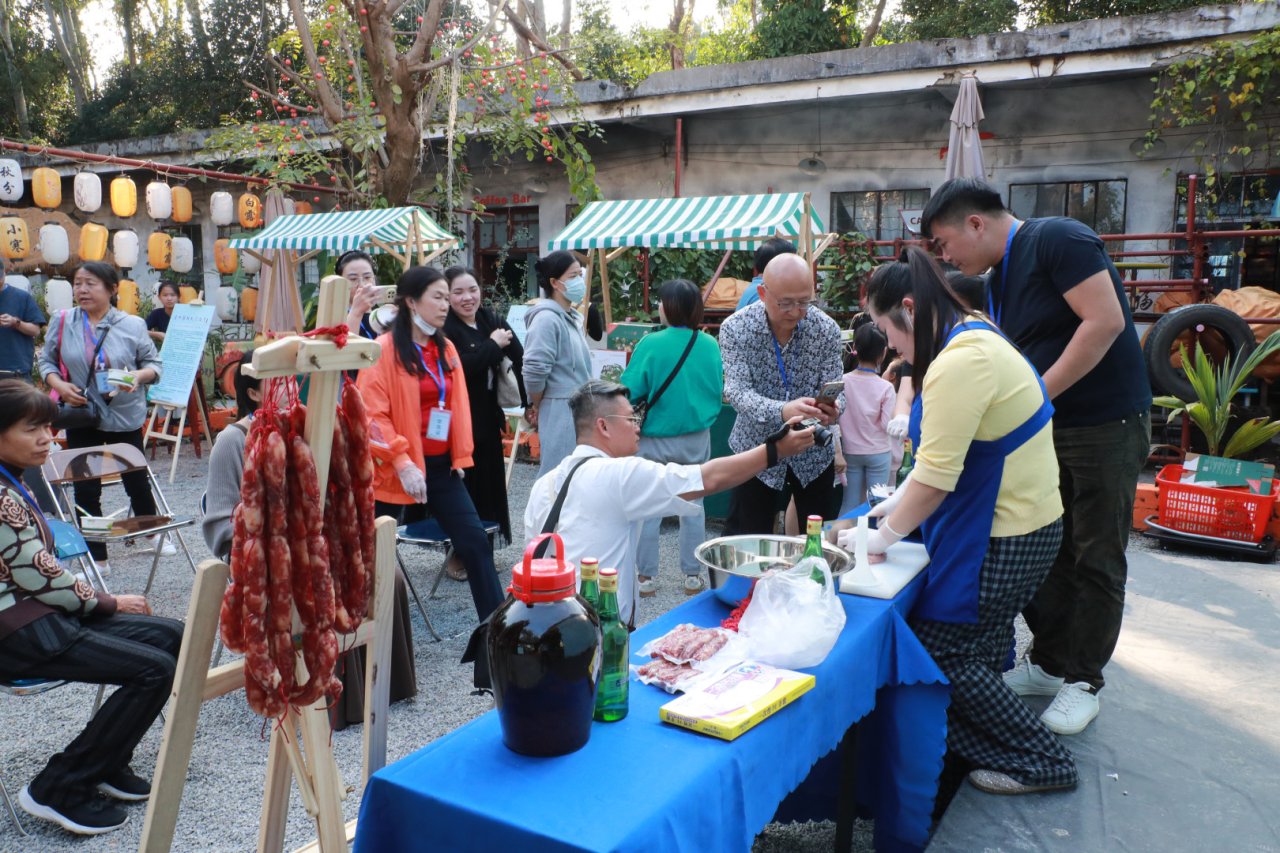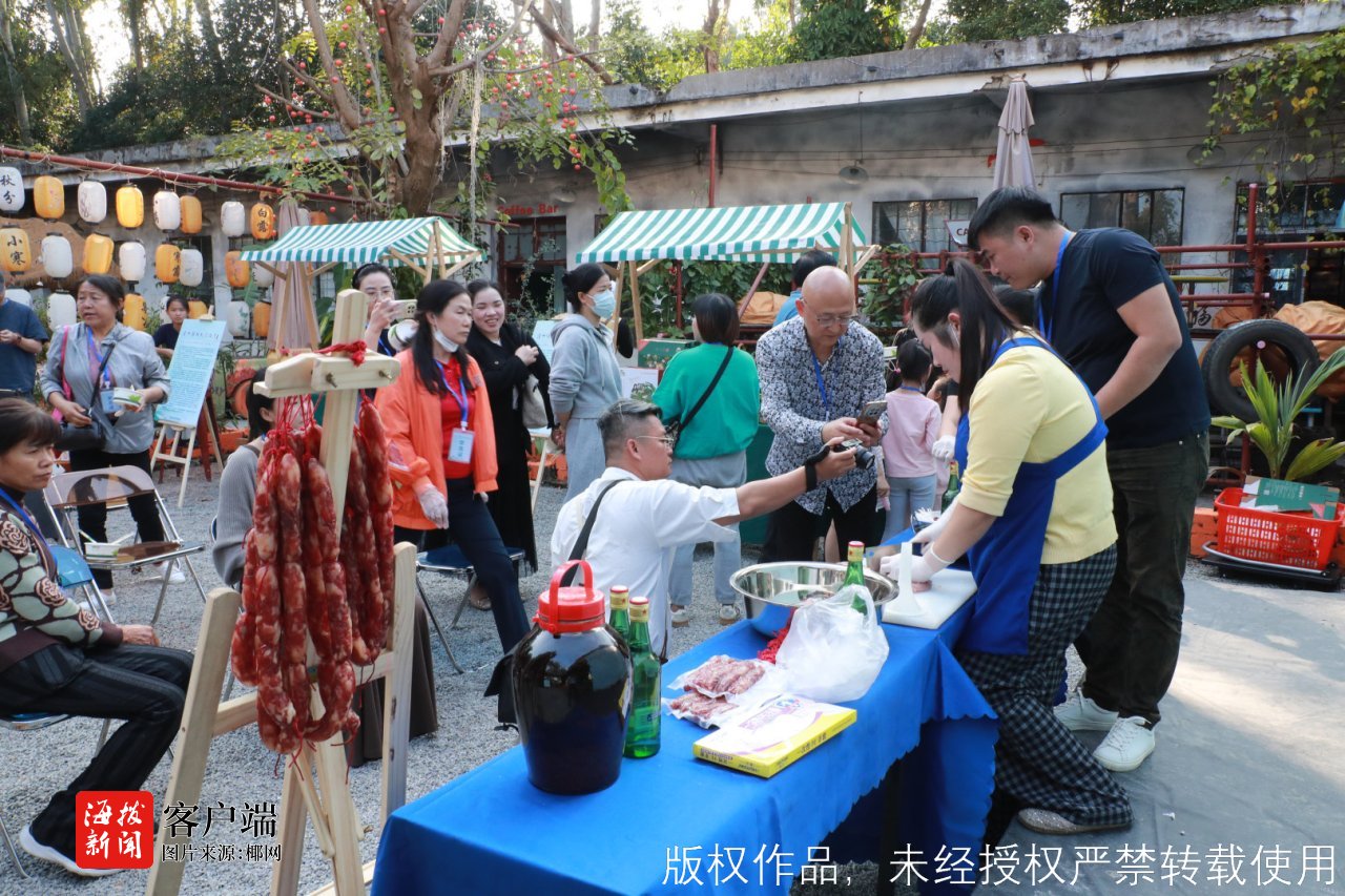 儋州腊肠制作技艺制作区则充满了烟火气。作为2022年列入市级非遗名录的项目,儋州腊肠以“三分肥七分瘦”的黄金比例和独特风味著称。儋州腊肠制作技艺非遗代表性传承人赖秀艳手持腌制好的肉馅,向学员演示灌制技巧。“儋州腊肠的制作共有七道工序,包括选料、切料、配料、灌肠、晾晒等步骤,最后需要晒足阳光十二天。”赖秀艳介绍,将肉切成肉条是为了使腊肠咬起来有爆汁感,并能满嘴留香,同时肉条状使得腊肠看起来虽肥实但吃起来肥而不腻,瘦而不柴。她说,很高兴能参与此次活动,希望更多人了解并喜爱儋州腊肠这一非遗项目。