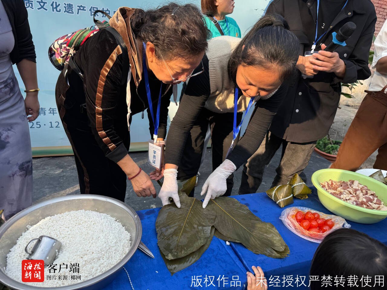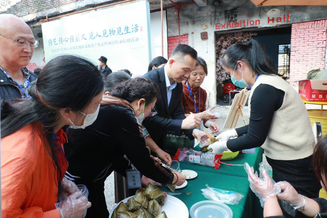 当天培训围绕“舌尖上的非遗”展开,儋州粽子手工技艺、鸡屎藤馍制作技艺、腊肠制作技艺三大美食类非遗项目同步开课,吸引了众多市民游客参与。