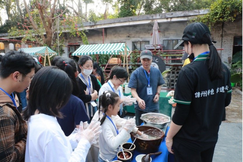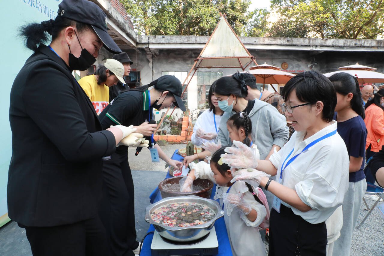 一旁的鸡屎藤馍制作区散发着自然气息。这种以野生植物鸡屎藤为原料的小吃,是儋州人记忆中的“童年味道”。“鸡屎藤被称为‘民间土参’,有清热解毒、促进消化等功效。”儋州鸡屎藤馍制作技艺老艺人曾彩富手持捣碎的鸡屎藤叶,向学员介绍其养生价值。从植物取色到揉面成型,学员们在传承人指导下体验了12道传统工艺。
