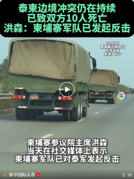 柬埔寨与泰国的边境冲突9日仍在持续。据泰国陆军当天消息,冲突已造成3名泰国士兵死亡。柬埔寨国防部当天早些时候表示,冲突已造成7名柬埔寨平民死亡,另有20人受伤。柬埔寨参议院主席洪森当天在社交媒体上表示,柬埔寨军队已对泰军发起反击。