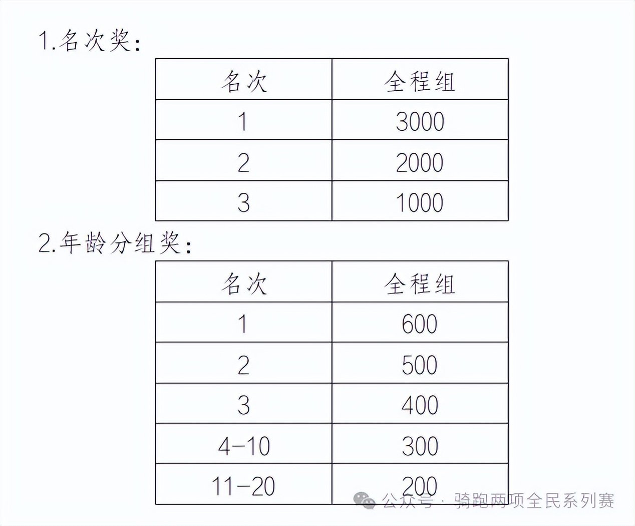 1.个人组男女净计时成绩前3名获奖金和奖杯;各年龄组前10名获奖金(各年龄组参赛人数低于50人时,将按照实际参赛人数调整奖励名次,各年龄组奖金奖励比例不超过20%),奖金分配方式如下:
