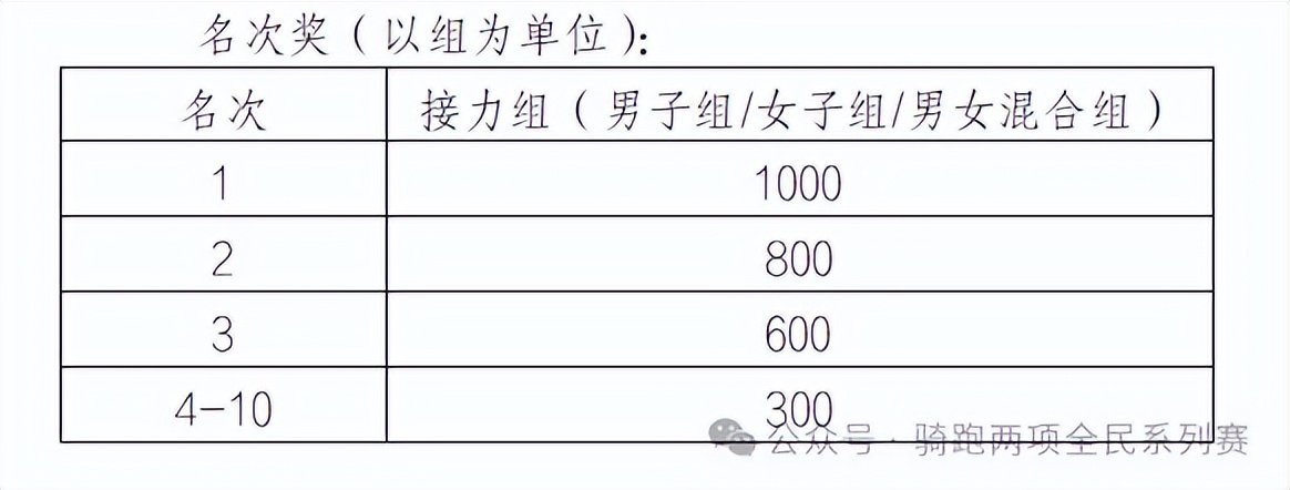 2.接力组(男子/女子/男女混合)净计时前3名获得奖金和奖杯;第4—10名获得奖金(各组参赛组数低于50组时,将按照实际参赛组数调整奖励名次,各组奖金奖励比例不超过20%),奖金分配方式如下:
