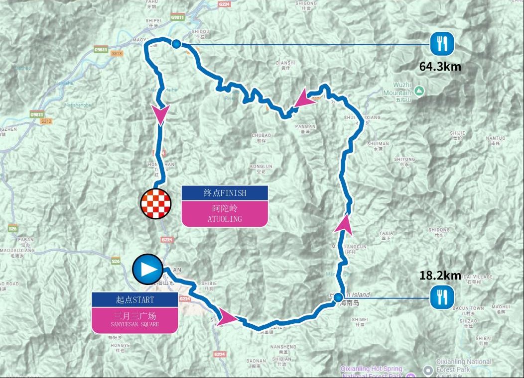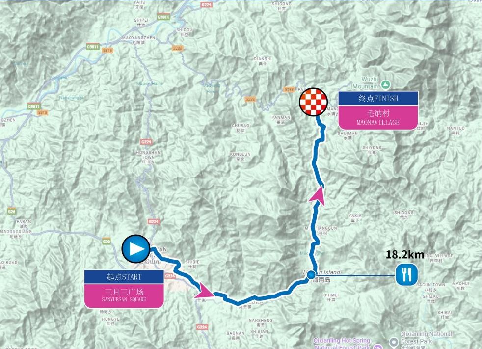 三月三广场(起点)—广场路—山兰路—解放路—三月三大道—河北东路—沿河北路—南圣转盘—X590-五指山红峡谷漂流起点—水满(半程组终点:毛纳村)—X583—毛阳—G224—阿陀岭(终点)。