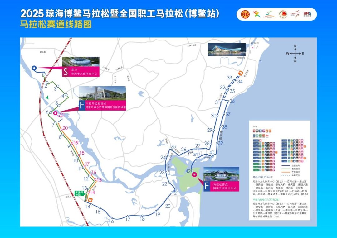 赛事路线:起点为琼海市文化体育中心,马拉松终点为博鳌亚洲论坛永久会址,半程马拉松终点为博鳌乐城永不落幕创新药械展;线路途经万泉河、博鳌乐城医疗旅游先行区、海的故事、博鳌书屋、东屿岛等区域,部分路段与海南环岛旅游公路重合。