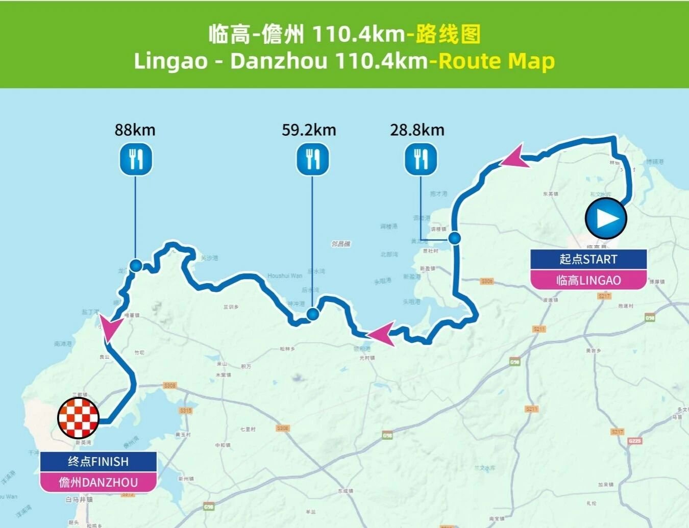 海南环岛旅游公路(儋州与临高交界点)→儋州追光驿站→海南环岛旅游公路→环新英湾大道→金浦路→横七巷→滨海路→洋浦滨海文化广场(终点)。