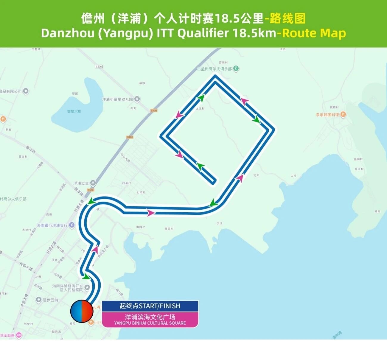 洋浦滨海文化广场(起点)→滨海路→横七巷→金浦路→新英湾大道→环新英湾大道→横十七巷→中心大道→横十三巷(绕圈)→环新英湾大道→新英湾大道→金浦路→横七巷→滨海路→洋浦滨海文化广场(终点)。
