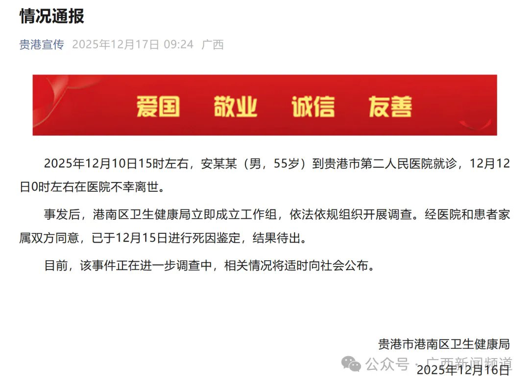 2025年12月10日15时左右,安某某(男,55岁)到贵港市第二人民医院就诊,12月12日0时左右在医院不幸离世。