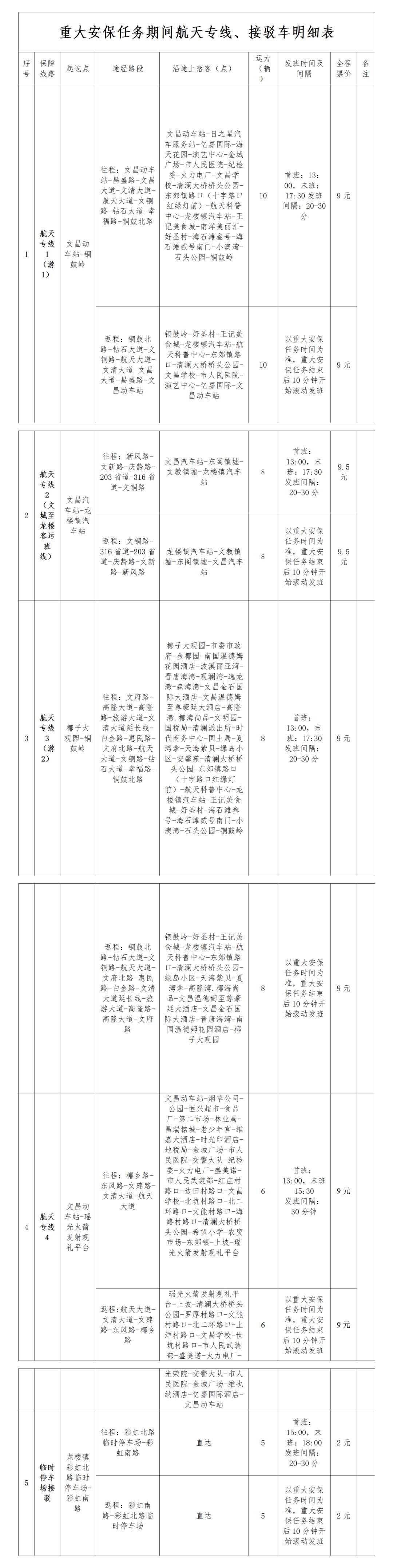 为确保重大安保任务期间文昌市龙楼镇道路交通安全畅通,有效缓解交通压力,文昌市交通运输局分别在文昌动车站、文昌汽车站、椰子大观园开通四条航天专线,其中专线2(文昌汽车站—龙楼镇汽车站)全程票价9.5元,其他专线全程票价9元。如需前往的游客和市民可在各点位乘坐专线车抵达龙楼镇,返程上车点即为往程下车点。