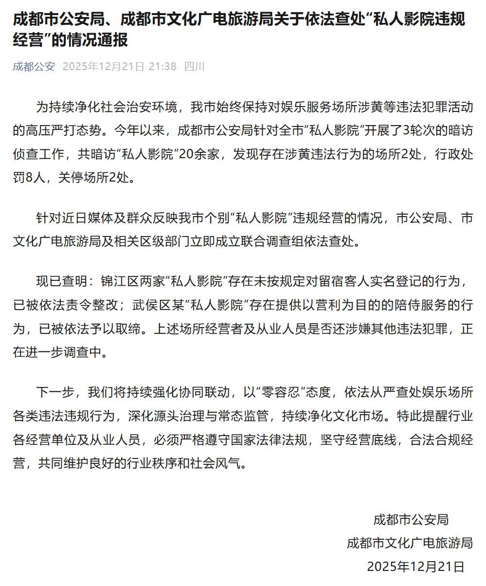 12月21日,成都市公安局、成都市文化广电旅游局发布关于依法查处“私人影院违规经营”的情况通报。
