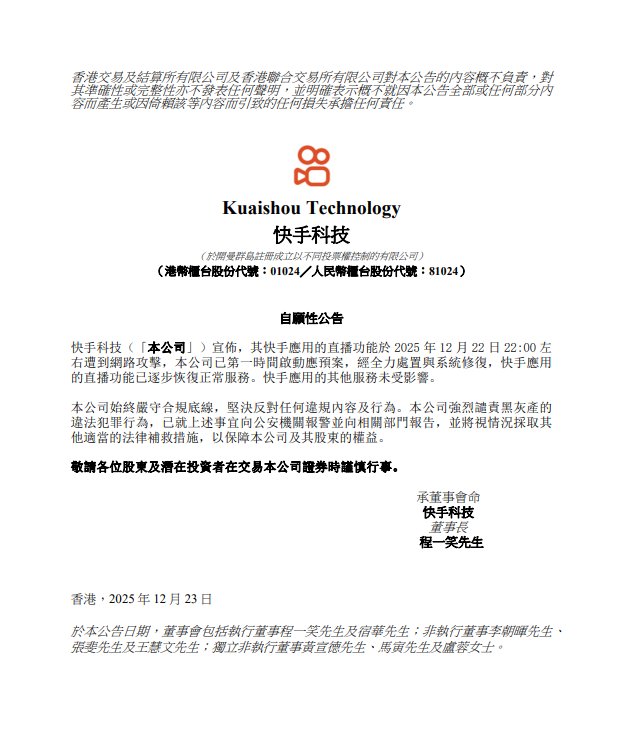 公司快手应用的直播功能于2025年12月22日22:00左右遭到网络攻击,公司已第一时间启动应急预案,经全力处置与系统修复,快手应用的直播功能已逐步恢复正常服务。快手应用的其他服务未受影响。