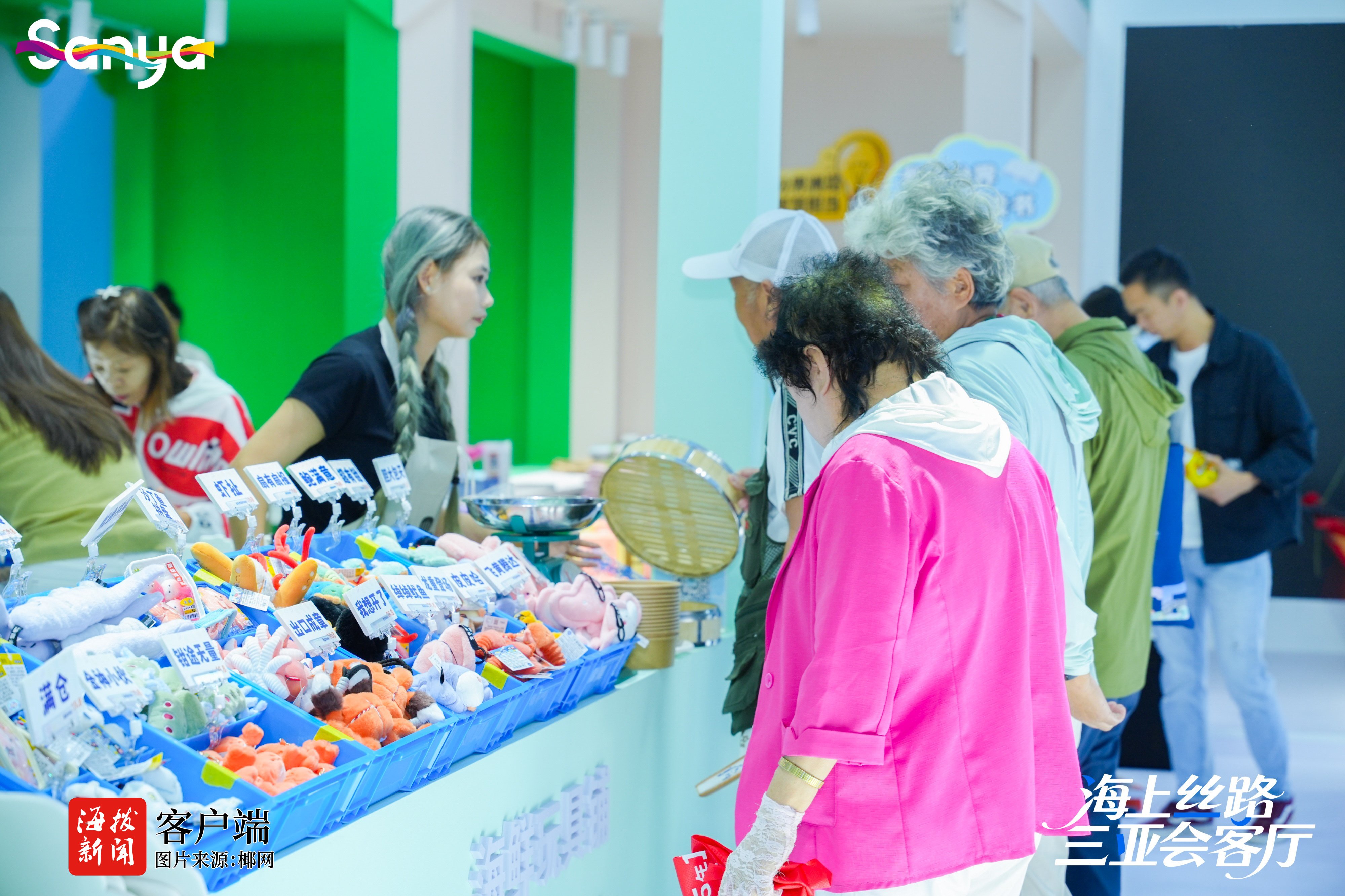 在三亚馆海鲜玩具铺展区,活灵活现的海鲜毛绒玩具吸引了许多市民游客打卡选购。“我们今天带来的展品有鱿鱼、章鱼、扇贝、海胆、大闸蟹等毛绒玩具,都是能展现海南当地特色的。同时也设计了特别的互动形式,让游客体验到在三亚购买海鲜并加工海鲜的过程。”海鲜玩具铺摊主胡鑫祺说。