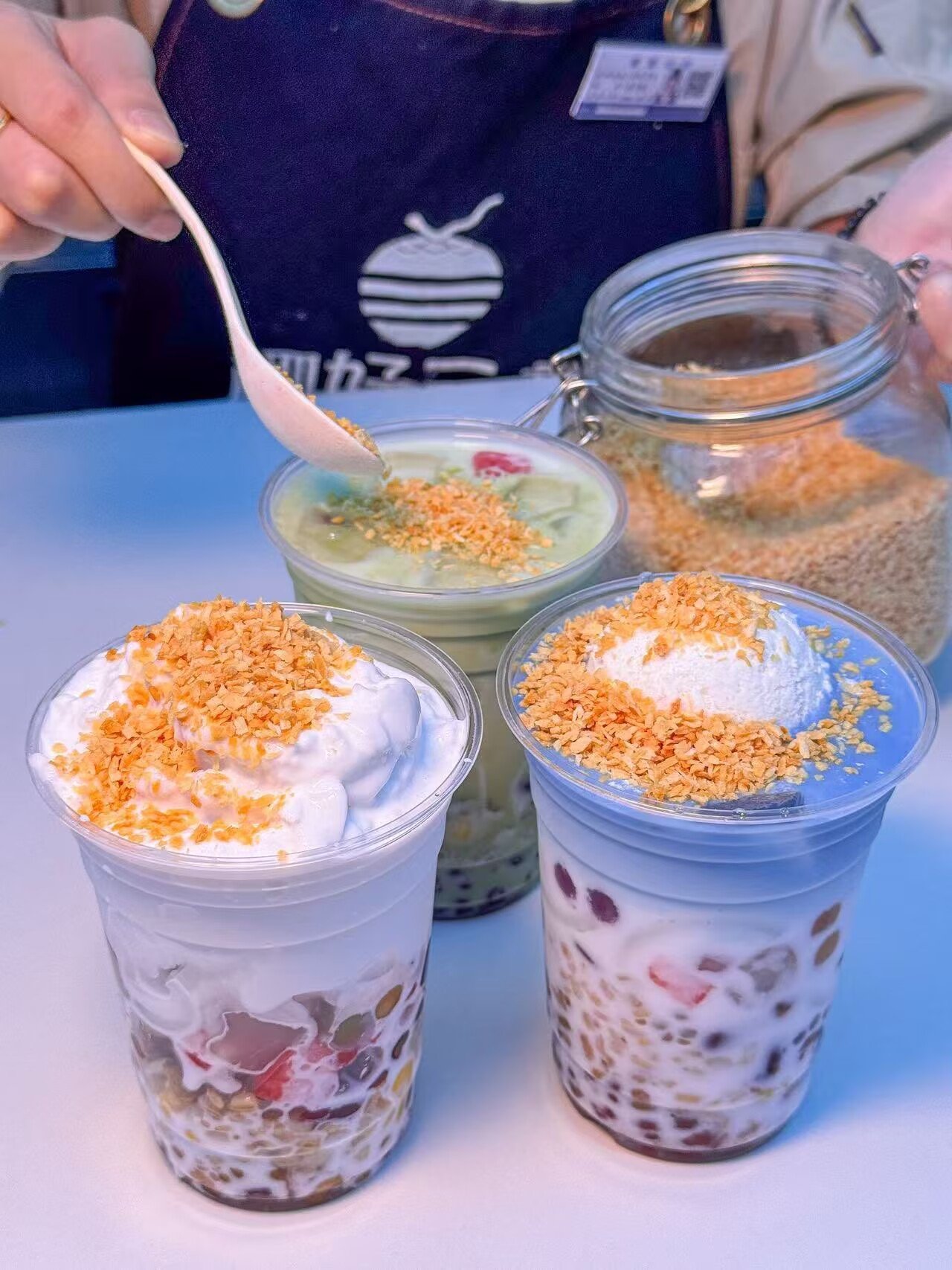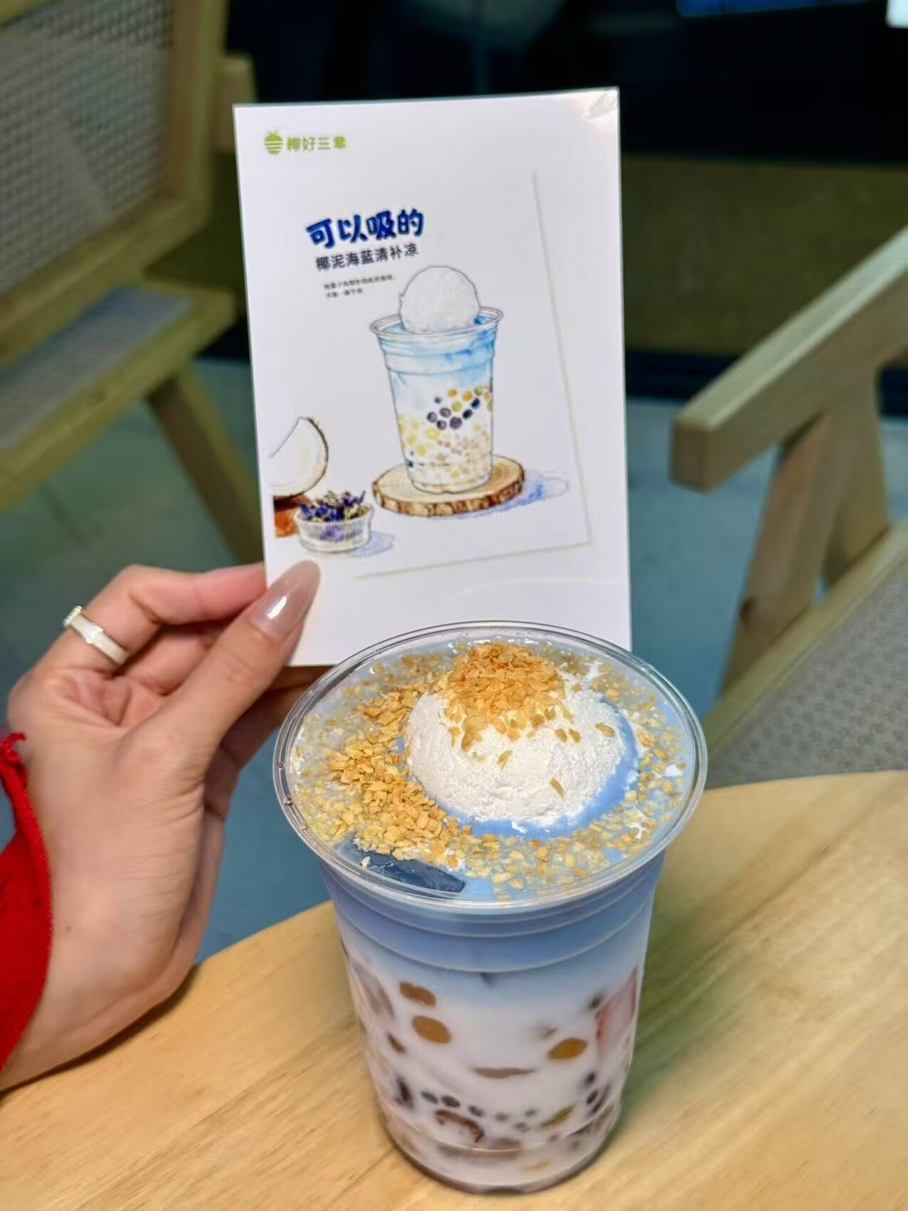 品牌的核心,始于一个清晰的承诺。蔡兴学将之概括为“三章”:不加椰浆、不加香精、不加防腐剂。在琳琅满目的甜品赛道,椰好三章选择回归食材本味。招牌的海蓝椰泥冰淇淋清补凉,以天然蝶豆花渲染出梦幻色泽,搭配十余种杂粮基底,口感丰富而毫无负担;桃胶椰奶清补凉则凸显滋补概念,大颗桃胶与醇厚生椰乳相得益彰。每一款产品,都试图在“老味道”与“新健康”之间找到平衡点。