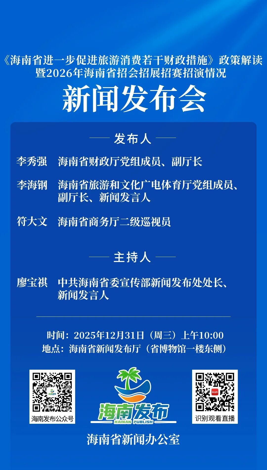 海南省新闻办公室将于2025年12月31日(星期三)上午10:00在海南省新闻发布厅(省博物馆一楼东侧)举行《海南省进一步促进旅游消费若干财政措施》政策解读暨2026年海南省招会招展招赛招演情况新闻发布会。邀请海南省财政厅党组成员、副厅长李秀强,海南省旅游和文化广电体育厅党组成员、副厅长、新闻发言人李海钢,海南省商务厅二级巡视员符大文介绍相关情况,并答记者问。