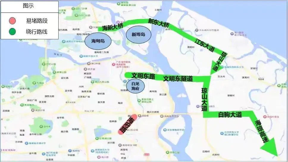 避开海秀快速路拥堵:预计12月31日下班与出城车流叠加,金垦、永万等匝道段双向拥堵严重。建议改走滨海大道,或选择海秀路、海盛路→长天路等道路分流。