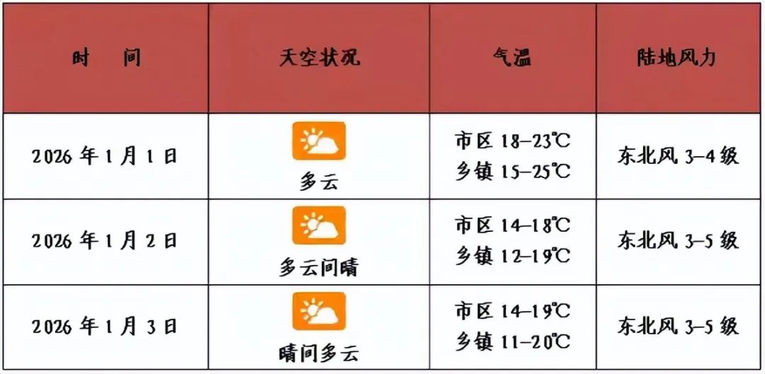 预计,元旦假期(2026年1月1日~3日),海口以多云到晴天气为主。