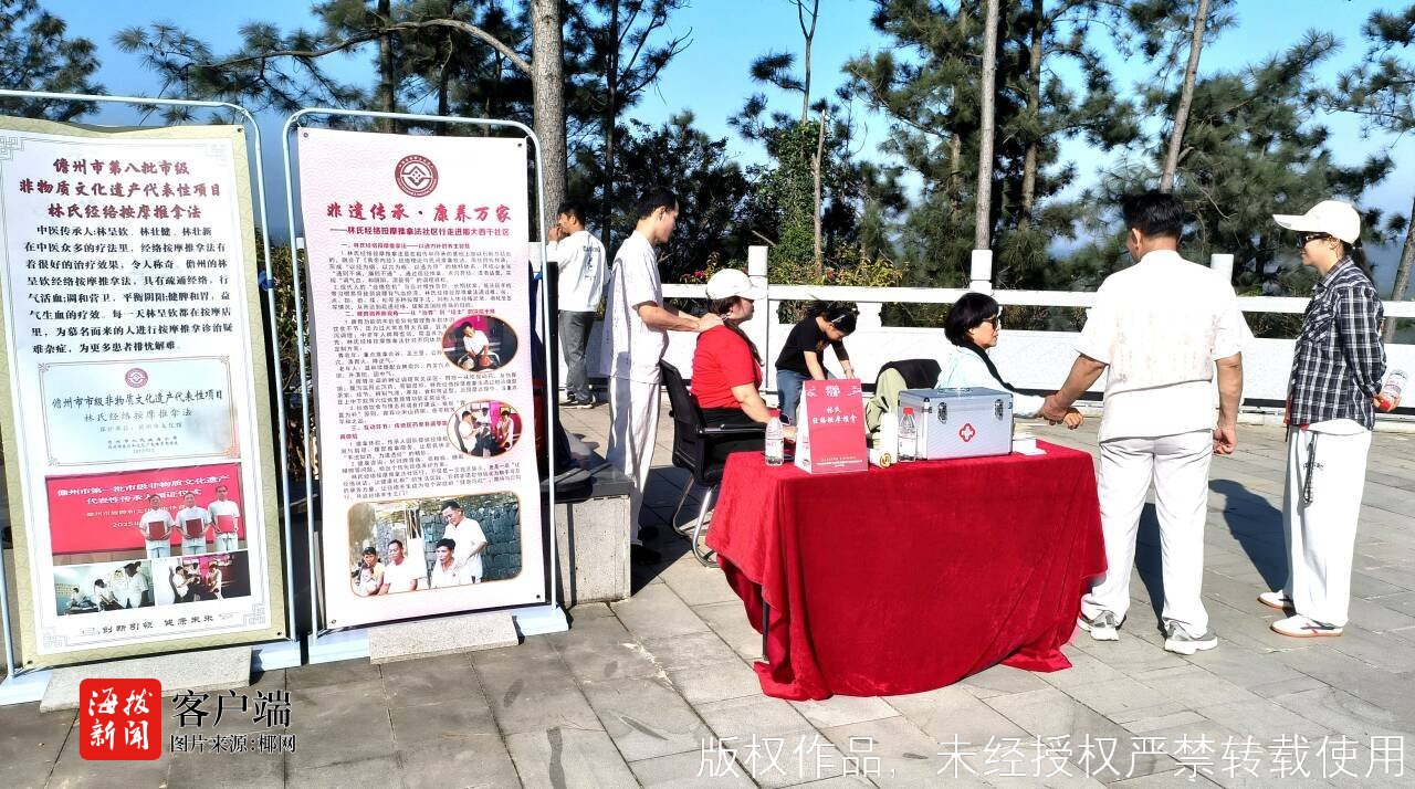 在活动休息区,林氏经络按摩推拿法的三位传承人正为登高归来的市民提供免费按摩推拿服务,帮助大家缓解登高后的疲劳。市级代表性传承人林壮健一边为市民按摩,一边介绍:“经络按摩推拿通过点按穴位、舒筋活络,有助于促进气血循环,是一种具有养生保健作用的自然方式。此次活动不仅倡导全民健身,也让非遗技艺走进了更多人的视野。我们要让非物质文化遗产更好地服务大众、惠及群众。”