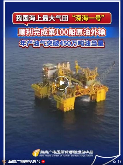 1月2日,中国海油对外宣布,我国海上最大气田“深海一号”近期完成投产以来的第100船原油外输工作,2025年气田油气总产量突破450万吨油当量,与陆地中型油田产量规模相当,我国深海气田生产运维技术达到世界先进水平。