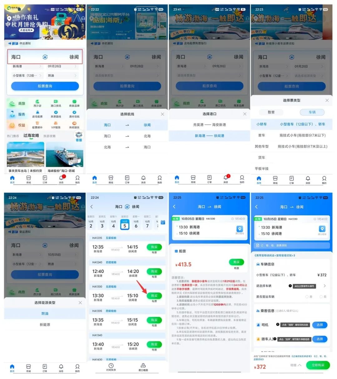 选择航线(如:新海港/秀英港⇋徐闻港/海安新港)。