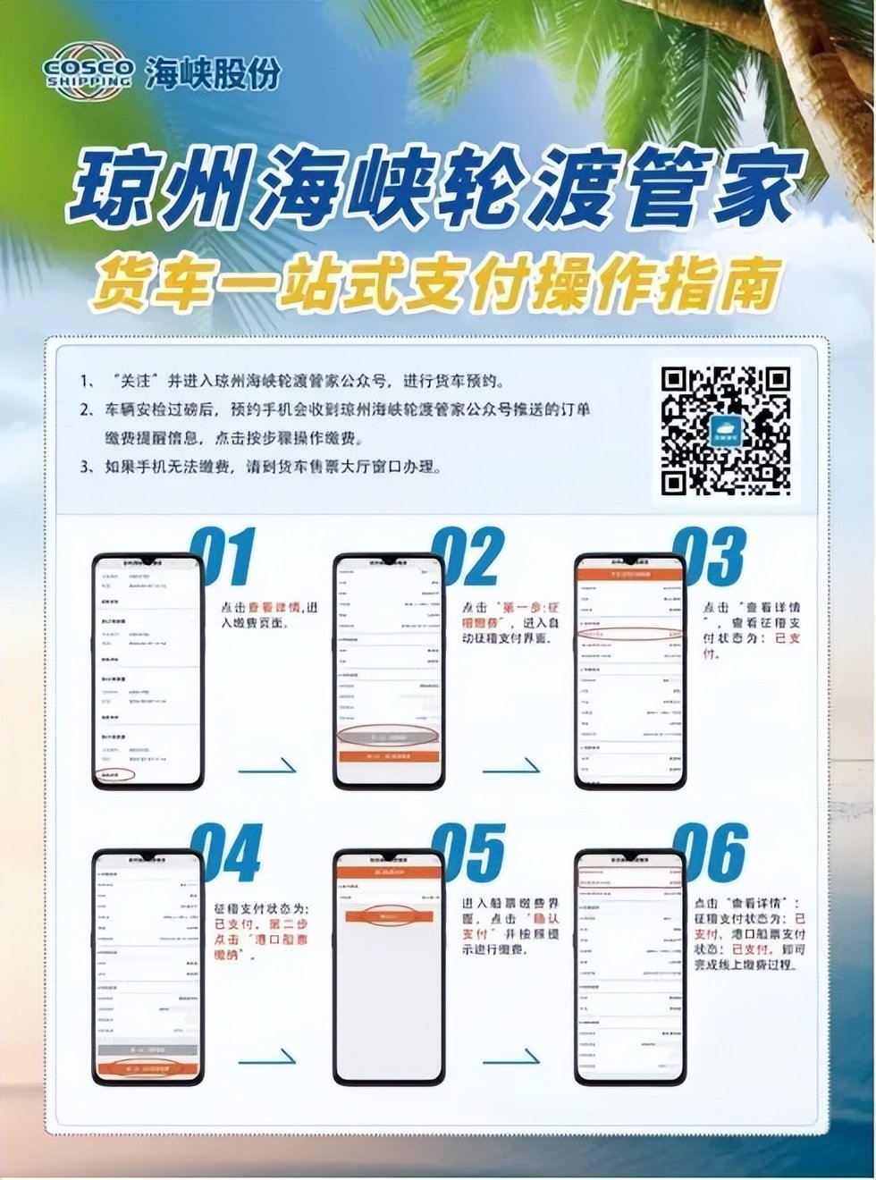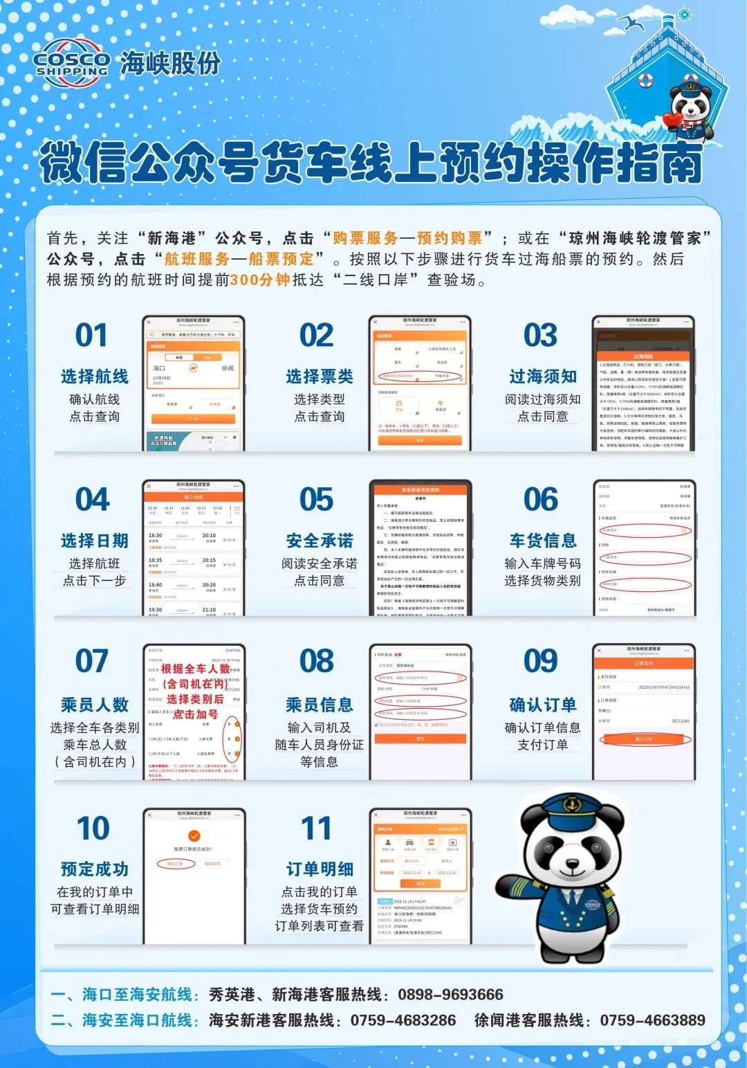 节假日期间会增开新能源车专班保障运力,请留意票面信息及港口提示(平日专班航线主要为秀英港⇋海安新港)。