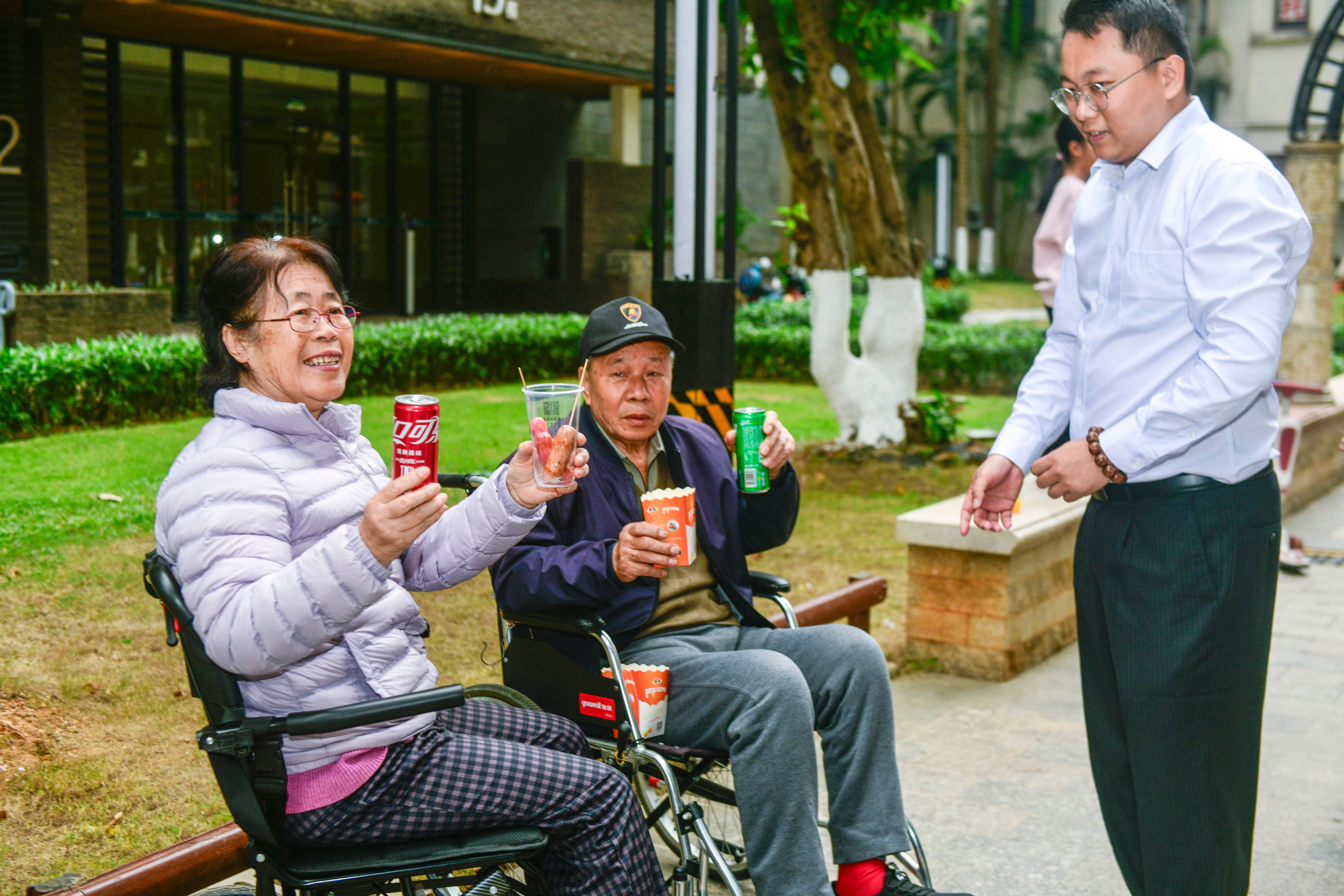 来自黑龙江的陆大爷和老伴,由于行动不便,来到活动现场后,坐在轮椅上看热闹,被细心的物业杨主任看到后,主动送去饮料等食品,让老人十分感动。
